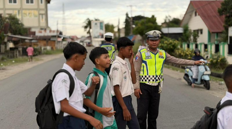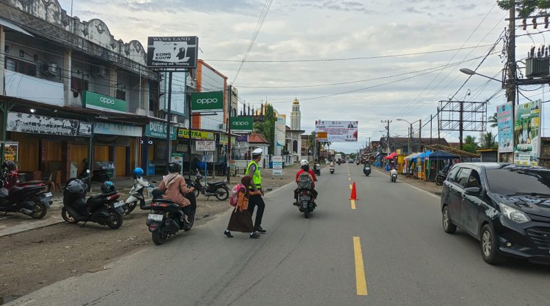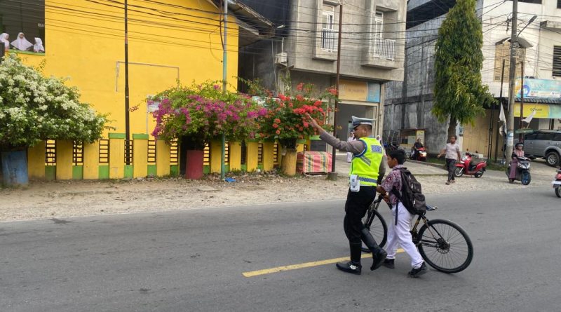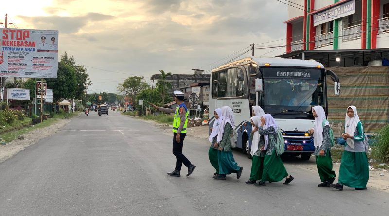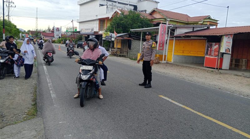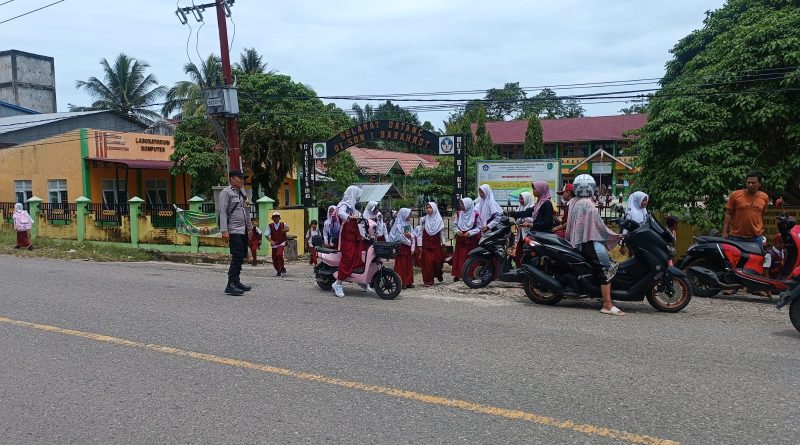 PERSONEL POLSEK MANGGENG POLRES ACEH BARAT DAYA GELAR STRONGPOINT PAGI DAN GATUR LALU LINTAS DI DEPAN SEKOLAH GUNA TERCIPTANYA KAMSELTIBCAR LANTAS