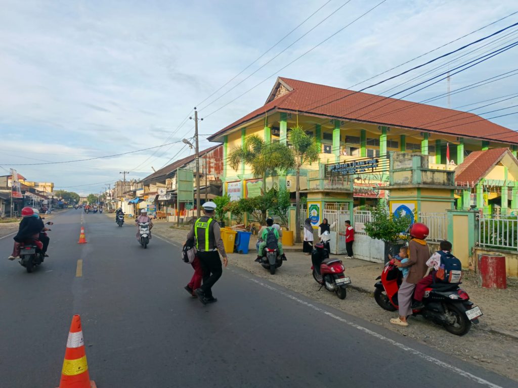Ciptakan Kamseltibcar Lantas Yang Aman dan Tertib, Satlantas Polres Abdya Laksanakan Strongpoint Pagi Di Depan Sekolah Dan Titik Rawan Kemacetan