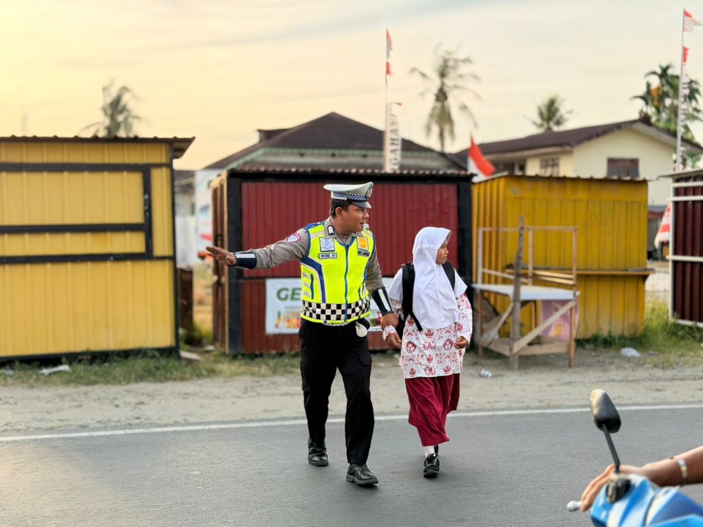 CIPTAKAN KAMSELTIBCAR LANTAS YANG TERTIB DAN LANCAR, PERSONEL SAT LANTAS ABDYA GELAR STRONGPOINT PAGI DI DEPAN SEKOLAH DAN TITIK RAWAN KEMACETAN