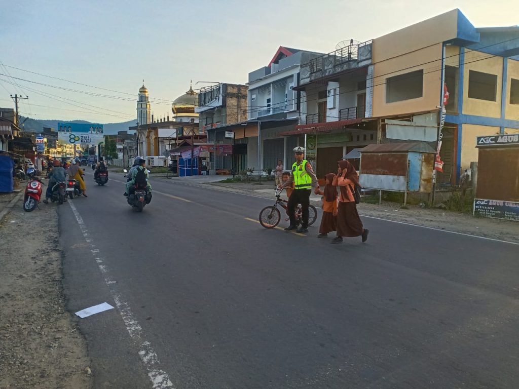 CIPTAKAN KAMSELTIBCAR LANTAS YANG TERTIB DAN LANCAR, PERSONEL SAT LANTAS ACEH BARAT DAYA LAKSANAKAN STRONGPOINT PAGI DI DEPAN SEKOLAH DAN TITIK RAWAN KEMACETAN