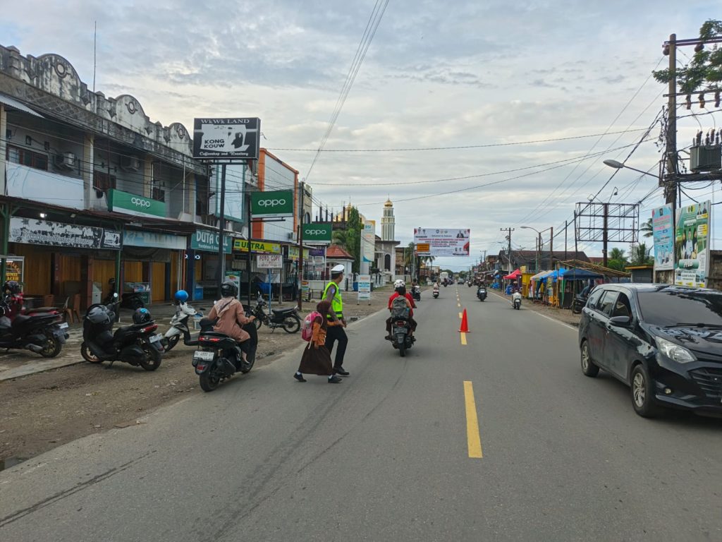 CIPTAKAN KAMSELTIBCAR LANTAS YANG TERTIB, SATLANTAS POLRES ABDYA LAKSANAKAN STRONGPOINT PAGI DI DEPAN SEKOLAH DAN TITIK RAWAN KEMACETAN