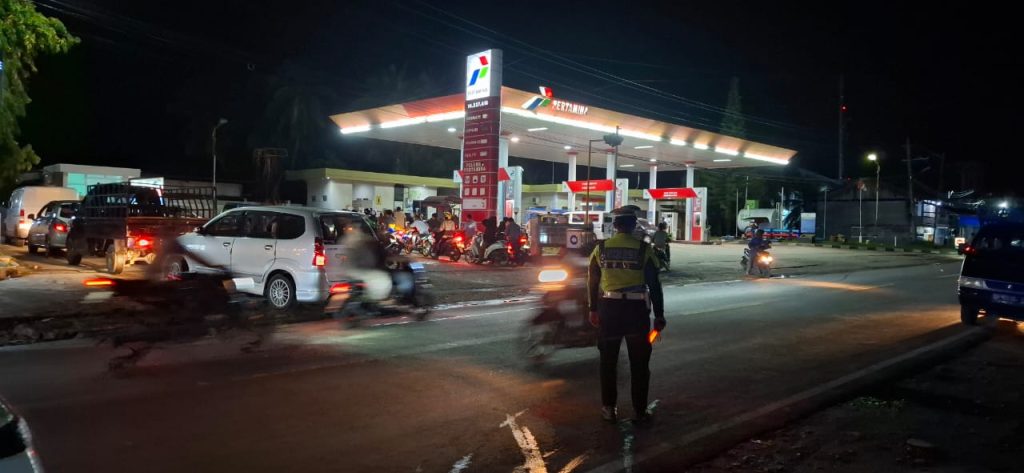 PERSONEL POLRES ACEH BARAT DAYA GELAR PENGATURAN ARUS LALIN TERHADAP ANTRIAN MASYARAKAT DI SPBU WILKUM POLRES ACEH BARAT DAYA
