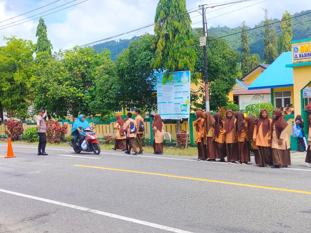 PERSONEL POLSEK KUALA BATE POLRES ACEH BARAT DAYA GELAR STRONGPOINT PAGI DAN GATUR LALU LINTAS DI DEPAN SEKOLAH GUNA TERCIPTANYA KAMSELTIBCAR LANTAS