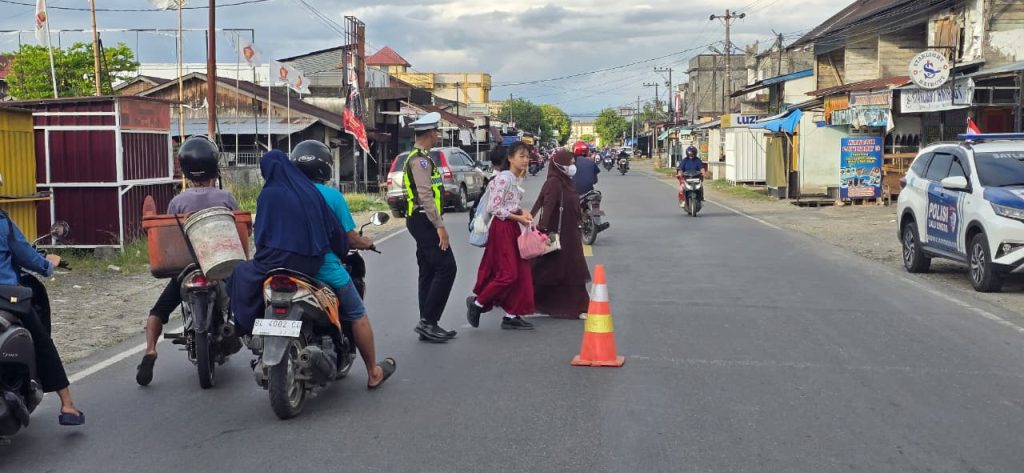 Aceh Barat Daya (Abdya) – Personel Satuan Lalu Lintas (Sat Lantas) Polres Aceh Barat Daya (Abdya) melaksanakan strongpoint pagi di depan sekolah-sekolah di wilayah Abdya, Kegiatan ini bertujuan untuk mencegah kemacetan dan membantu anak sekolah menyeberang jalan dengan aman. Kamis (16/04/2026)