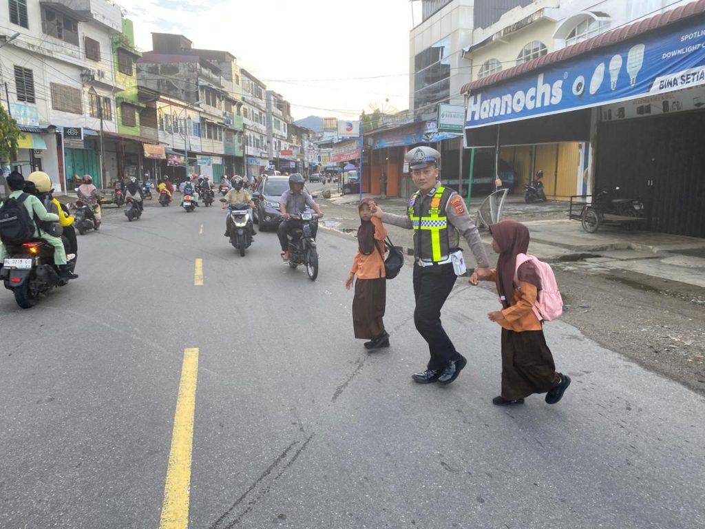 Personel Sat Lantas Polres Abdya Gelar Strongpoint Pagi di Depan Sekolah-sekolah, Cegah Kemacetan dan Bantu Anak Sekolah Nyebrang Jalan Raya