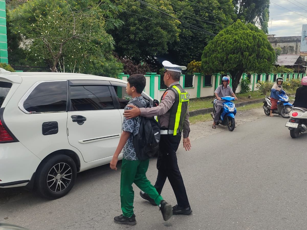 Personel Sat Lantas Polres Abdya Laksanakan Strongpoint Pagi di Depan Sekolah, Cegah Kemacetan dan Bantu Anak Sekolah Nyebrang Jalan